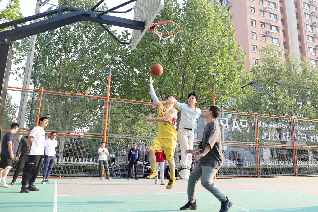 4月19日,市民在石家庄市裕华区丁香园公园球类运动场地打篮球。新华社记者 骆学峰 摄
