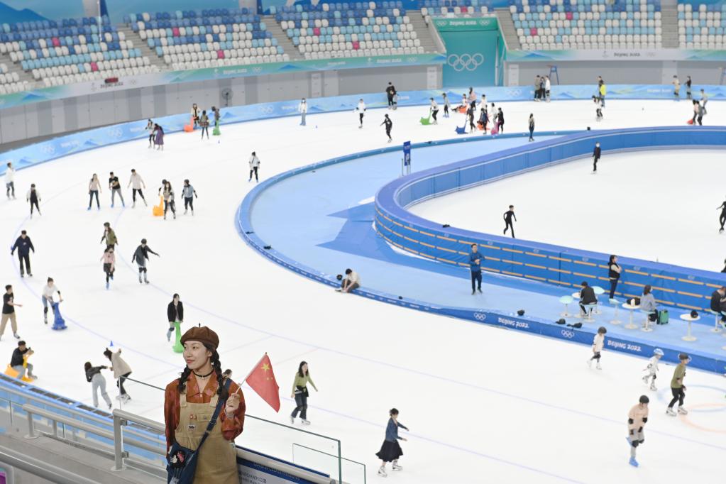 10月1日,参观者在“冰丝带”的观众看台拍照留影。新华社记者 宋为伟 摄