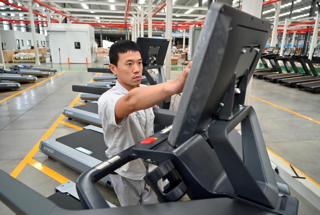 8月30日,在日照经济技术开发区一家企业组装车间,工人调试出口欧美国家的智能跑步机。新华社记者 范长国 摄