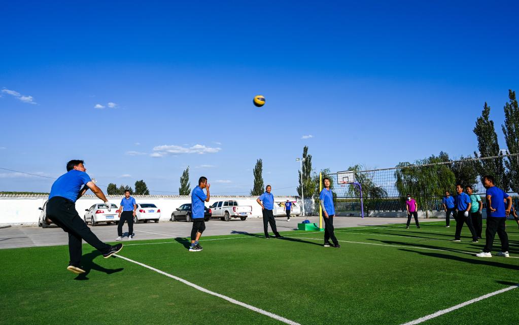 8月30日,牧民们在昂素镇巴彦希里嘎查的球场上打排球。新华社记者 连振 摄