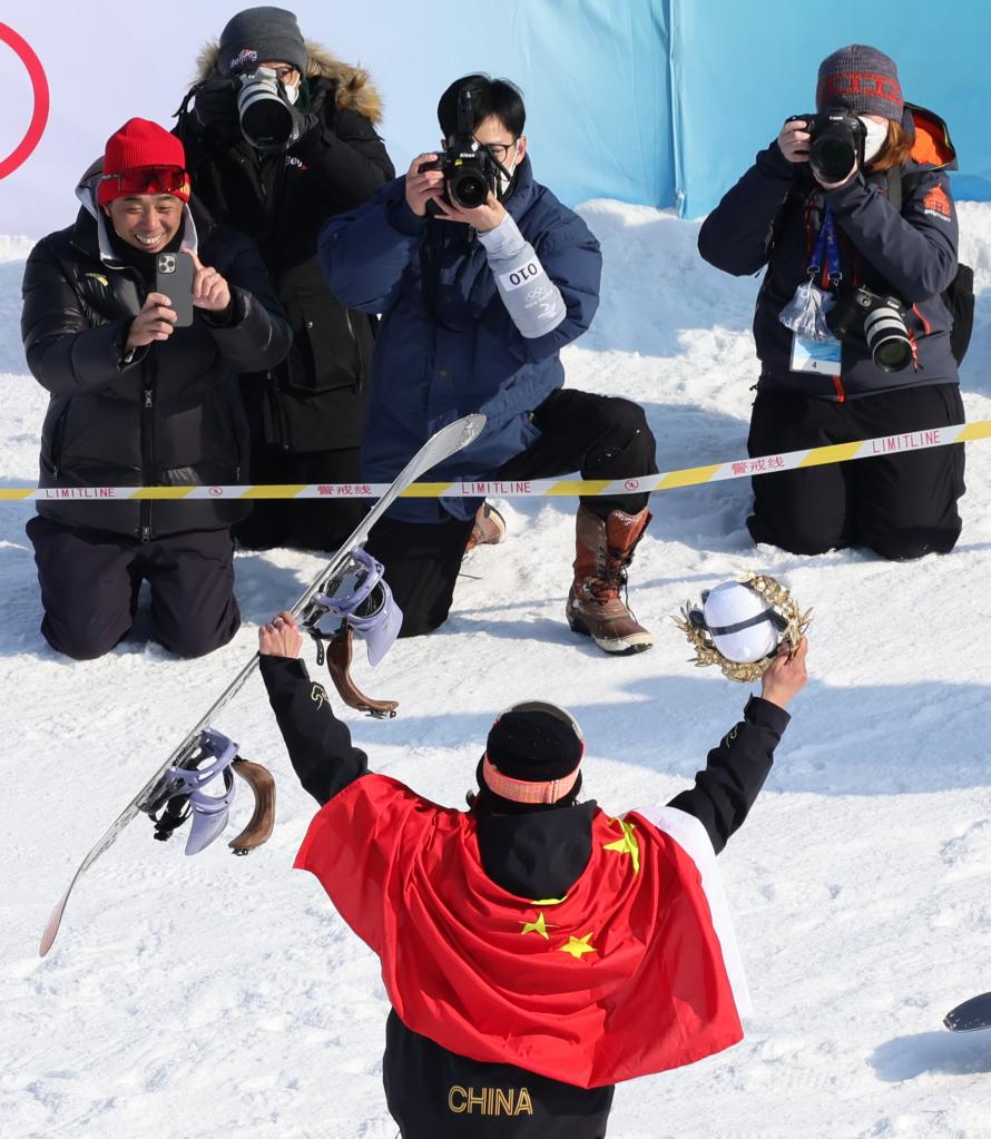 2月15日,中国选手苏翊鸣在颁发纪念品仪式后庆祝。新华社记者 兰红光 摄