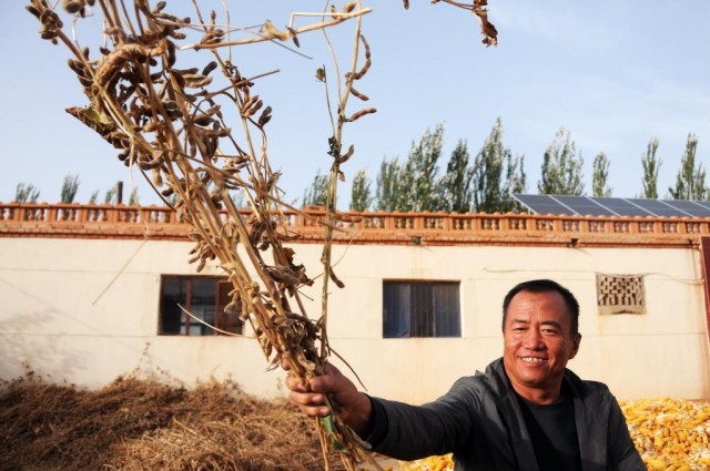 临河区干召庙镇永丰村村民白亮展示结实饱满的大豆秆。(新华社记者李云平 摄)