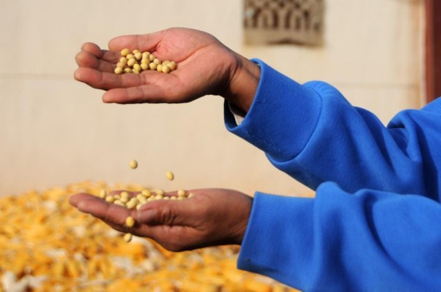 临河区干召庙镇永丰村村民展示清选出的大豆。(新华社记者李云平 摄)