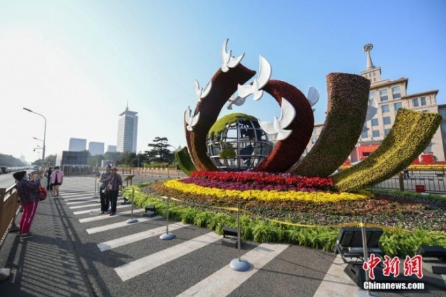 资料图:2022年9月26日,北京市长安街沿线国庆主题花坛亮相,吸引市民拍照“打卡”。图为位于军事博物馆前广场的“命运共同体”花坛,寓意深化全球发展合作,共创共享和平繁荣美好未来。 中新社记者 赵文宇 摄