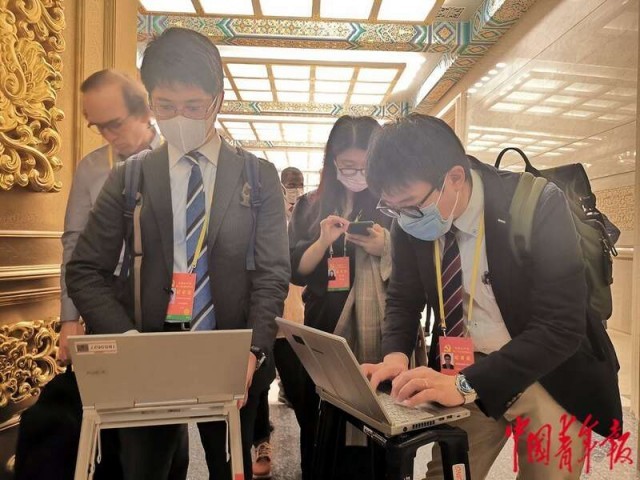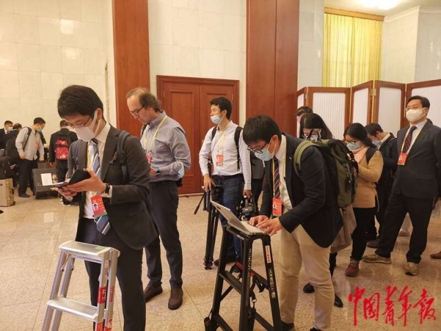 中国青年报客户端北京10月23日电(中青报·中青网记者 张国)今天,中国共产党第二十届中央政治局常委同中外记者见面会后,两位日本记者一边排队领会议材料,一边在梯凳上赶稿。海内外媒体对中共二十大高度关注。