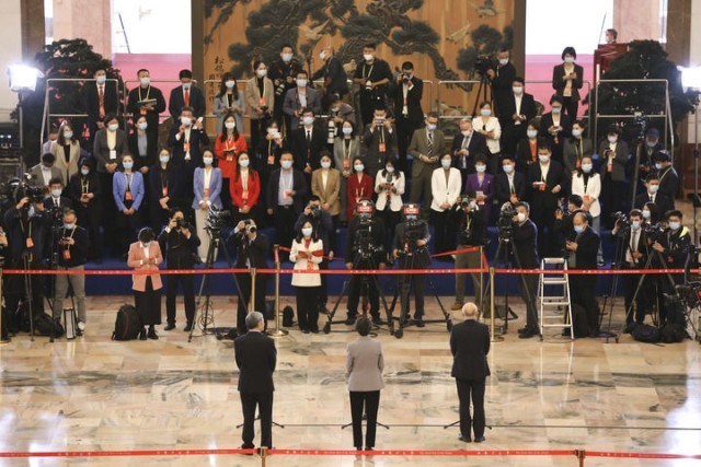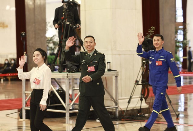 朱有勇、王亚平、武大靖代表(自左至右)在“党代表通道”接受采访。新华社记者 金良快 摄