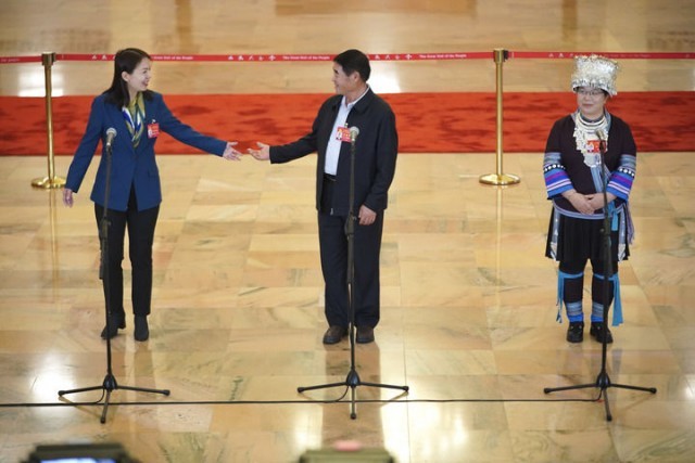 姜丽娟、孙金龙、於若飞代表(自左至右)步入“党代表通道”,准备接受采访。新华社记者 邢广利 摄