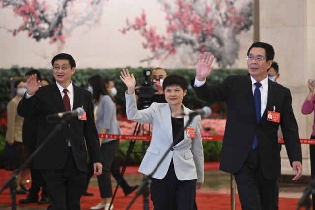 吴燕生、朱敏、张连钢代表(自左至右)步入“党代表通道”,准备接受采访。新华社记者 金良快 摄