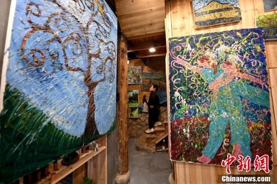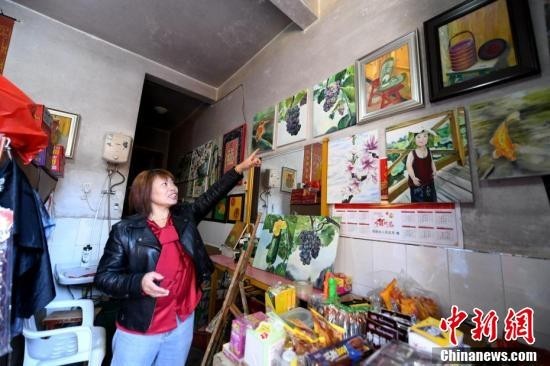 不少村民把老宅、仓库都改建成画室,几乎家家都有人在画画。民宿和乡村旅游业也渐渐升温,许多海内外艺术家以及艺术院校的师生循声而来,实验活化古村落、古民居。图为黄余清的食杂店里挂满了她的画作,她是村里学画最早的一批,一直坚持到现在。