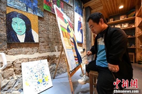 2015年11月,通过当地残联介绍,沈明辉开始学习油画。在这之前,他在街头以售卖气球为生。 王东明 摄