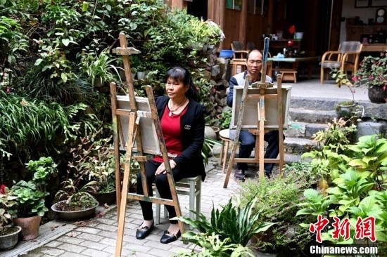 屏南县龙潭村的陈孝高、谢秀凤夫妇在家里画油画。学画画后,他们从农民转行开了民宿。
