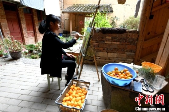 龙潭村的谢秀凤在家里作画,边上还放着她刚从山上采摘下来的柿子。