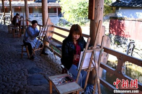 屏南县漈下村的村民黄余清(右一)等在村里的雨廊里学习画画。 王东明 摄