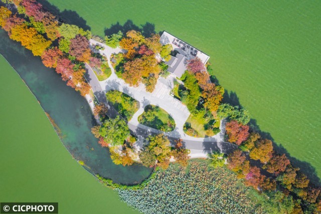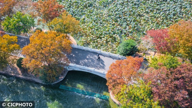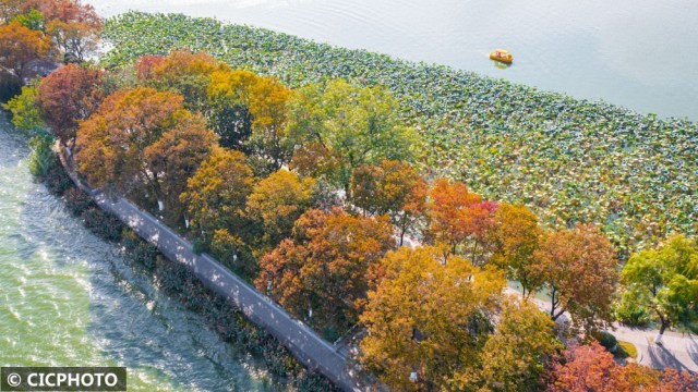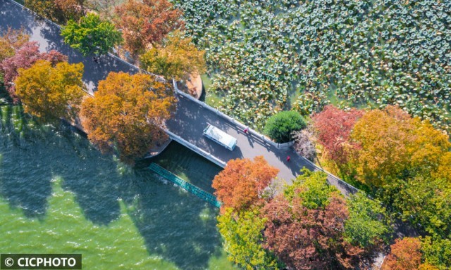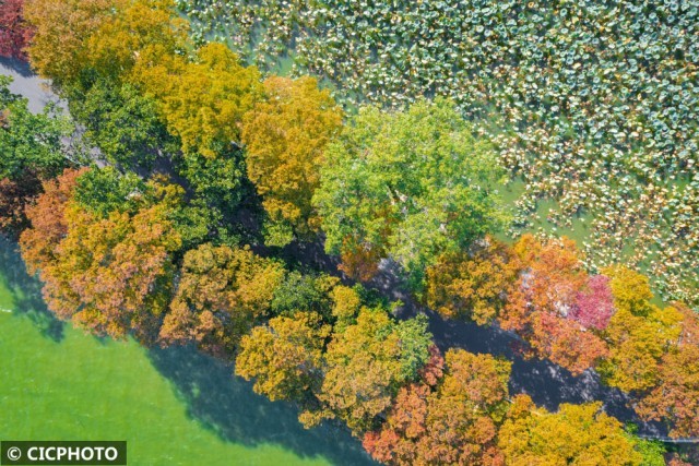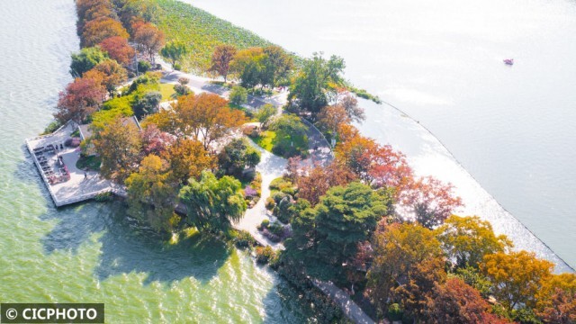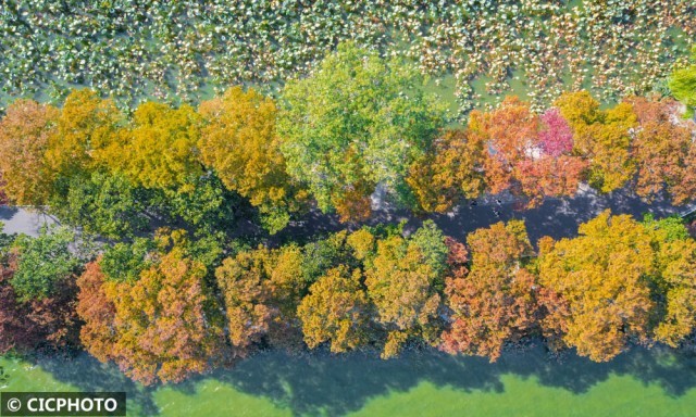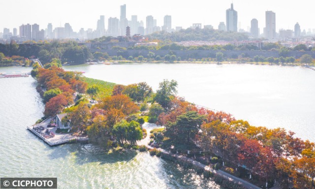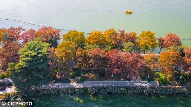 金秋时节,江苏南京玄武湖景区秋意正浓,湖堤上的植被色彩斑斓,美如画卷。
