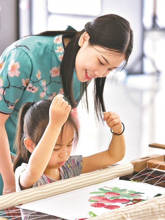 梁晓曼在指导小朋友制作广绣 受访者供图