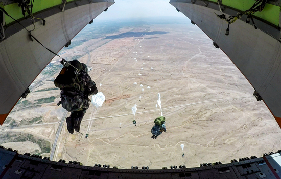 伞兵从运输机尾门跃出机舱。陈立春/摄