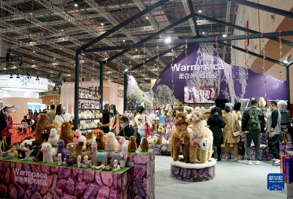 第四届中国国际进口博览会消费品展区的秘鲁羊驼毛玩偶展台(2021年11月6日摄)。新华社记者 刘颖 摄
