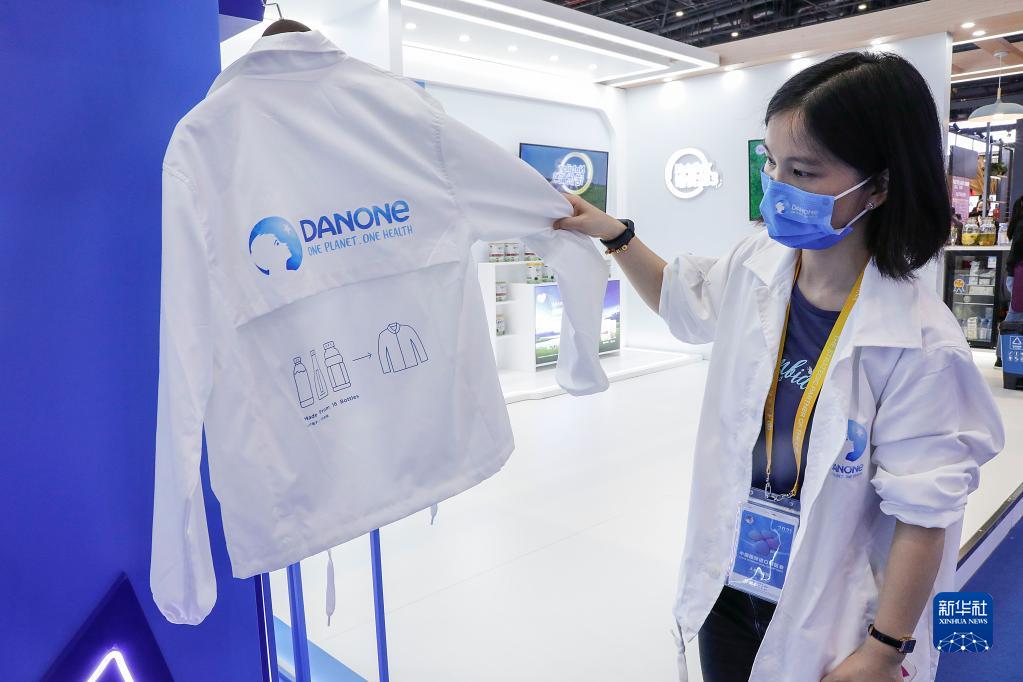 工作人员在第四届中国国际进口博览会食品和农产品展区达能展台展示用塑料饮料空瓶制造的外套(2021年11月6日摄)。新华社记者 张玉薇 摄