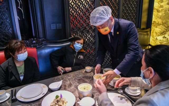 2022年5月10日,在济南一家餐饮店内,服务员为顾客上菜。新华社记者朱峥 摄