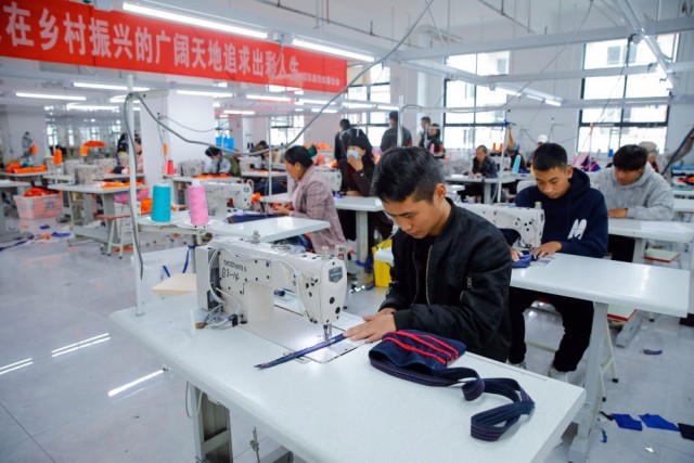 2022年10月28日,在四川省凉山州越西县越城镇城北感恩社区附近的居家灵活就业示范基地,易地扶贫搬迁到此的居民接受缝制服装的技能培训,培训合格后,他们将在此正式上岗工作。新华社记者沈伯韩 摄