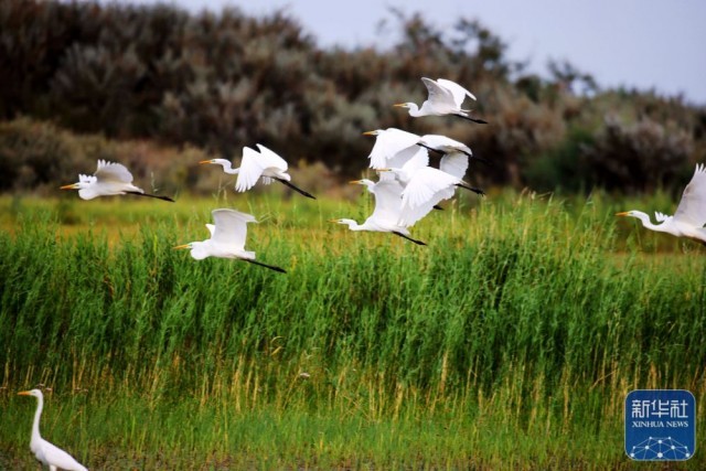 ↑新疆阿勒泰科克苏湿地国家级自然保护区内的白鹭(2022年8月8日摄)。新华社发(阿尔达克·拜斯汗 摄)
