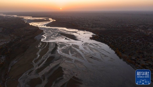 ↑这是在塔克拉玛干沙漠腹地拍摄的新疆于田克里雅河国家湿地公园(2019年11月10日摄,无人机照片)。新华社记者 胡虎虎 摄