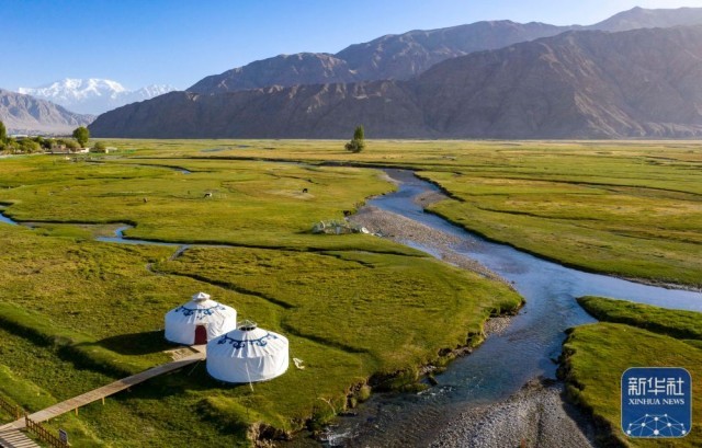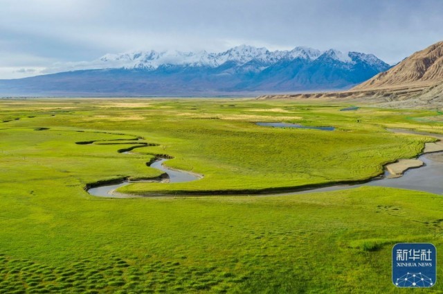 ↑新疆塔什库尔干塔吉克自治县塔合曼湿地夏季景观(2019年6月30日摄,无人机照片)。新华社记者 胡虎虎 摄