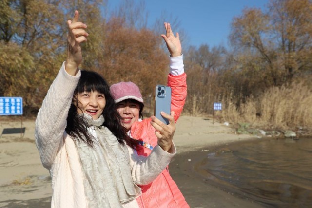 哈尔滨市两名游客正在湿地公园内自拍留念。新华社记者戴锦镕 摄