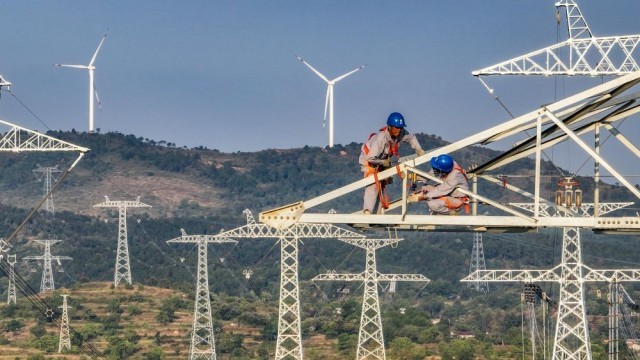 图为国网山西省电力公司的作业人员在铁塔上作业。(受访企业供图)