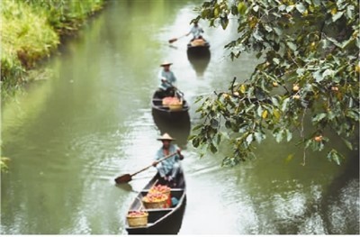 图为西溪湿地的工作人员用船运送刚采摘的柿子。