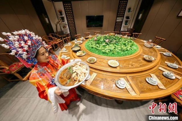 色香味俱佳的“全鱼宴”菜品,由身着古装的服务员端上桌。 王耀 摄