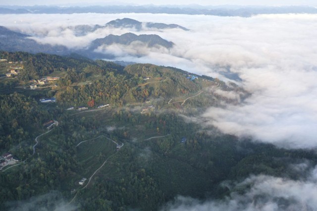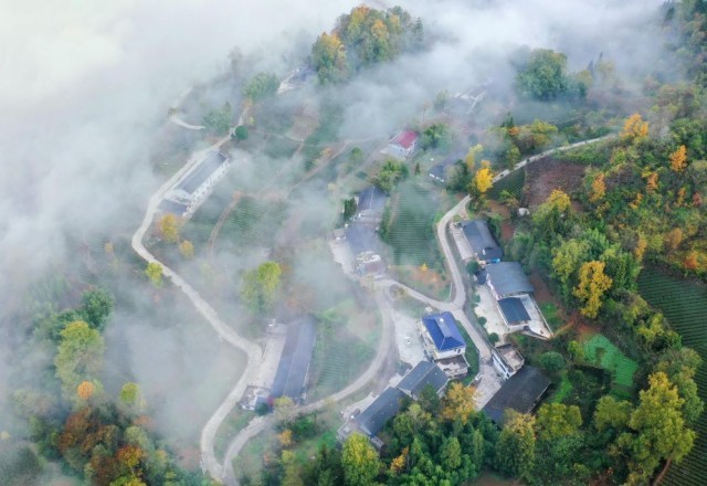 ↑这是宣恩县椒园镇黄坪村的山间公路和民居(11月24日摄,无人机照片)。