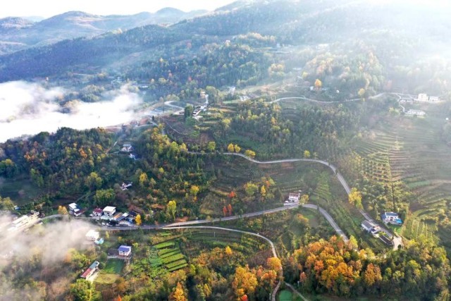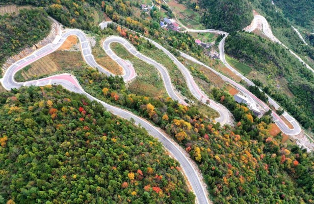 ↑通往宣恩县珠山镇东门关村的乡村公路在色彩斑斓的山间穿行(11月25日摄,无人机照片)。