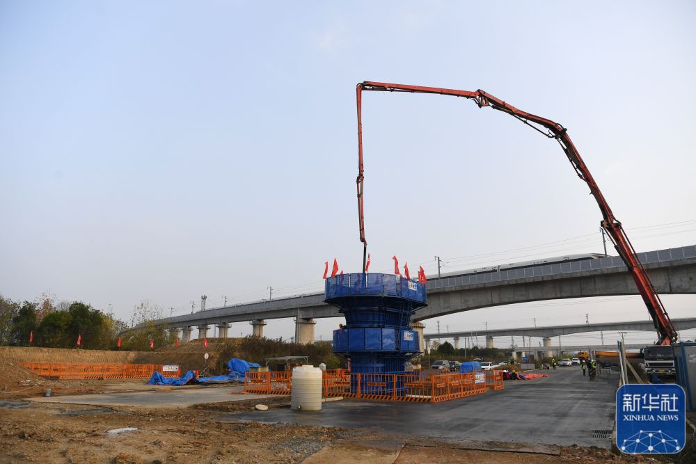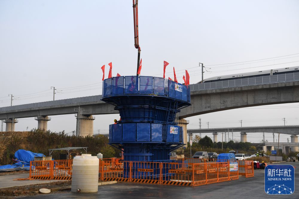 ↑11月26日,中铁四局施工人员在新建沪宁合高铁安徽段首根墩身浇筑现场作业。
