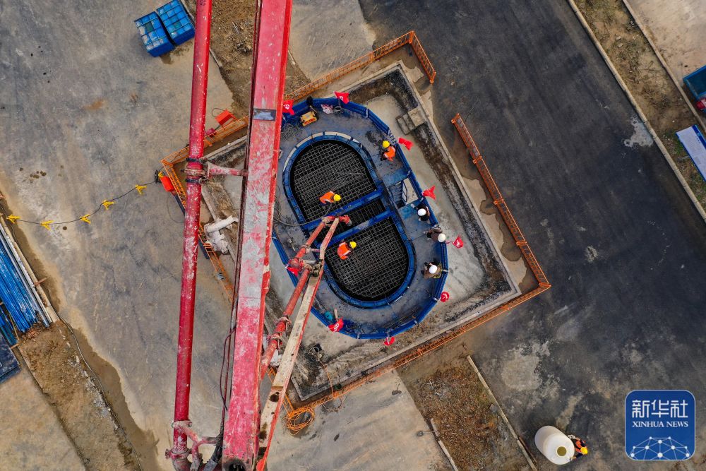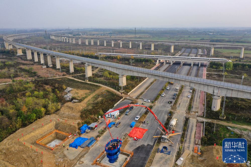 ↑11月26日,中铁四局施工人员在新建沪宁合高铁安徽段首根墩身浇筑现场作业(无人机照片)。