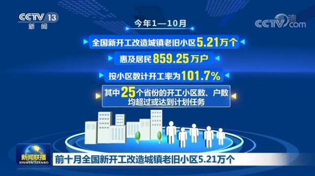住房和城乡建设部表示,今年1—10月,全国新开工改造城镇老旧小区5.21万个,惠及居民859.25万户,按小区数计开工率为101.7%,其中25个省份的开工小区数、户数均超过或达到计划任务。