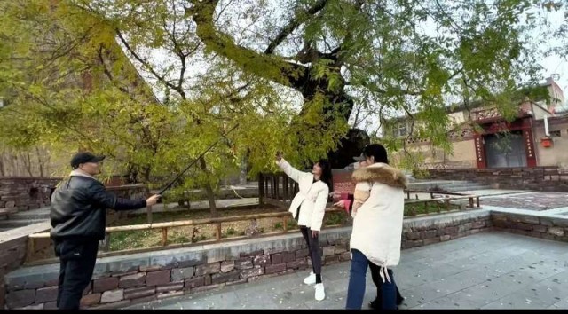 冬日暖阳下,游客们在河南省林州市黄华镇庙荒村皂荚树广场打卡留影。 中青报·中青网记者 潘志贤/摄
