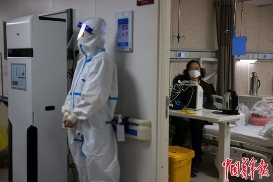 12月27日,北京朝阳医院发热门诊留观病房,一名病情趋于平稳的新冠重症患者准备转移到其他病房,一名医护人员在门外时刻待命。每腾空一张病床,就意味着多一名患者能获得治疗的机会。