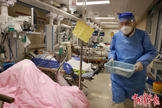 12月27日,记者在北京朝阳医院急诊科看到,诊室已从3个增加至6个,专科病房“去专科化”,全部改为了综合病房,过道里也排满了临时床位。急诊科收治重症患者的病房均由呼吸、重症、急诊的专家领军,其他专科的大夫和护士支援,尽可能减少重症病死率。“很多重症病人慕名而来,我们也会尽最大努力收治。”朝阳医院党委委员、急诊医学科副主任梅雪说,“这不是平时的看病了,这像是打一场仗。”