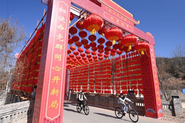 这是1月10日在渭源县田家河乡元古堆村拍摄的灯笼彩门。新华社记者范培珅 摄