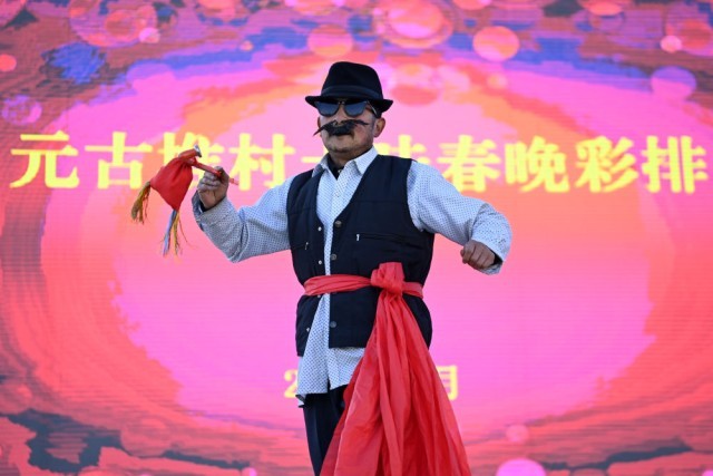 1月10日,在渭源县田家河乡元古堆村村民广场,村民进行土味春晚节目彩排。新华社记者范培珅 摄