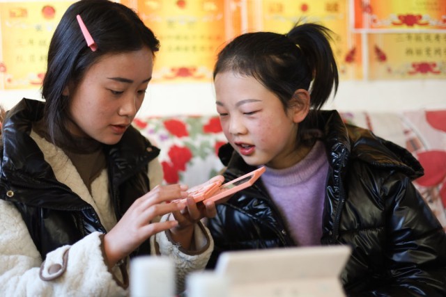 1月10日,在渭源县田家河乡元古堆村,韩丽军(左)在春晚彩排前化妆。新华社记者马希平 摄