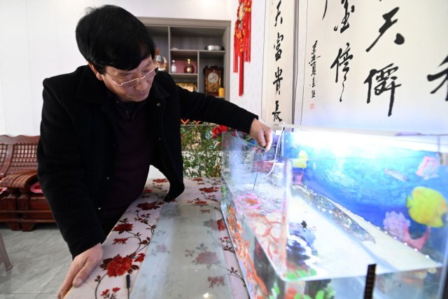 1月10日,在渭源县田家河乡元古堆村,黄郁春打理自家的鱼缸。新华社记者范培珅 摄