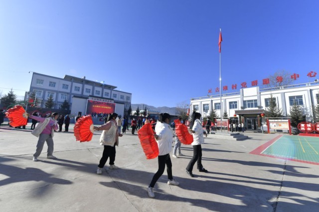 1月10日,在渭源县田家河乡元古堆村村民广场,群众排练土味春晚。新华社记者范培珅 摄