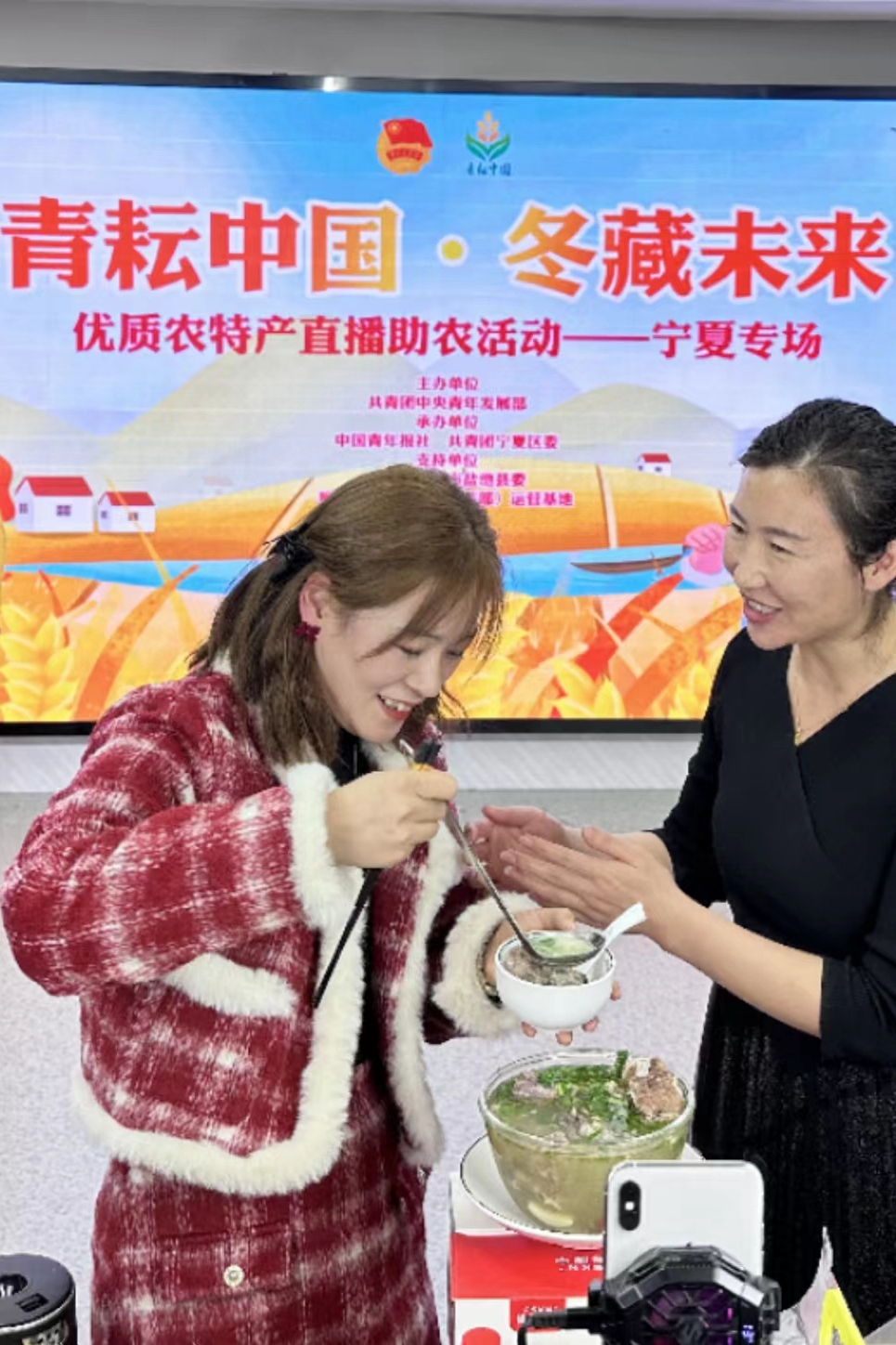 主播和盐池团县委书记陈艳宁介绍宁夏滩羊肉。共青团吴忠市盐池县委供图