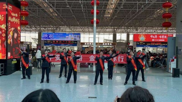 与略显冷清的北京站相比,1月18日的昆明站却有一番热闹景象。当天,昆铁公安青年志愿者在候车大厅里表演,为广大春运旅客送去新春祝福。(中国青年报·中青在线记者 何欣 摄)
