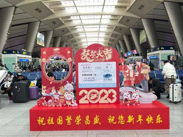 1月19日,北京南站,候车大厅里陈设着一张“巨大车票”,目的地是“家”,为旅客送去了一份温馨祝福。(中国青年报·中国青年网记者 孟佩佩 摄)