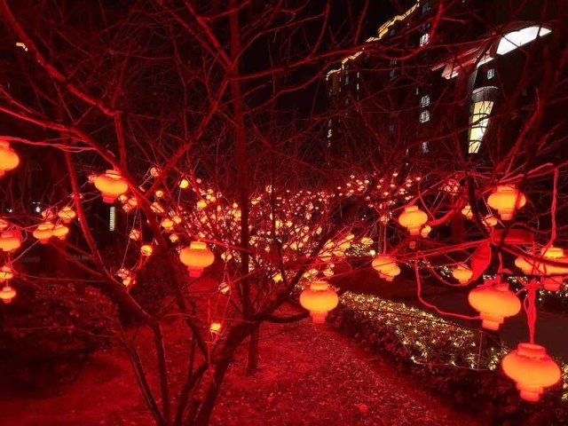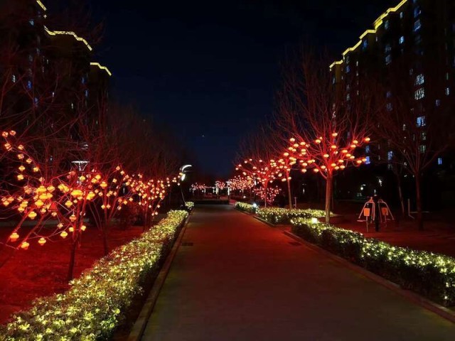 1月14日,北方小年,北京丰台一社区里张灯结彩,树上挂满红灯笼,灌木里布置星星点点的LED灯,营造出一派喜庆又梦幻的气氛。(中国青年报·中青在线记者 李澎 摄)