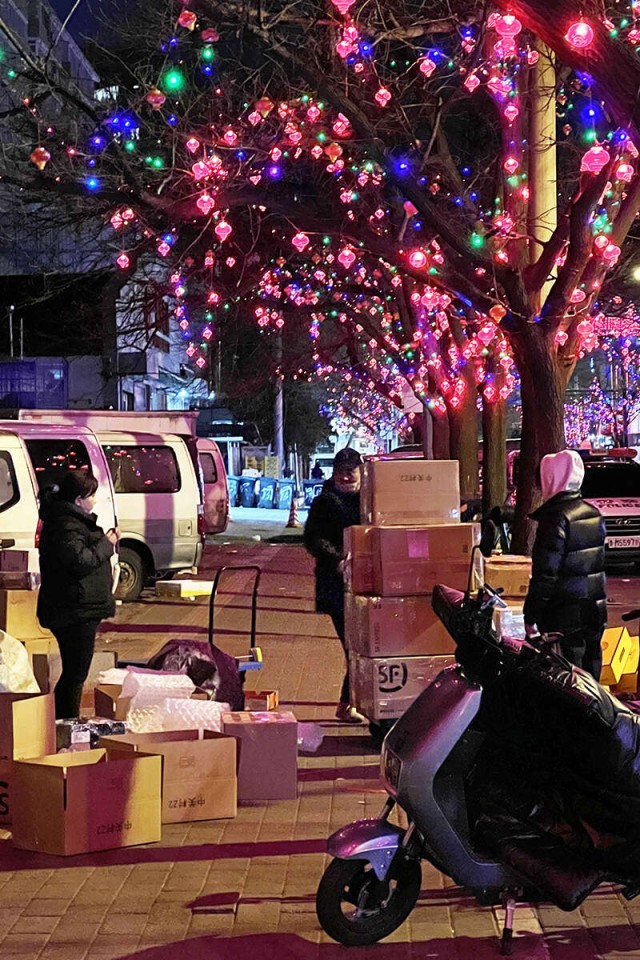 1月15日,腊月二十四夜,北京新源里菜市场外亮起春节灯饰,商家正在发快递送年货。(中国青年报·中青在线见习记者 李悠扬 摄)