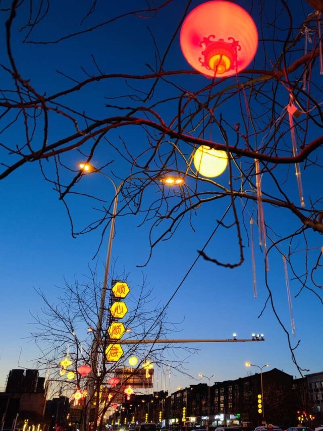 1月15日晚,北京顺义区顺于路,道路两侧的灯杆上挂着寓意着新的一年“顺心顺意”的彩色灯箱。树上各式各样的红灯笼和造型各异的灯饰,烘托出街道浓浓的春节氛围。(中国青年报·中青在线记者 杨海琴 摄)